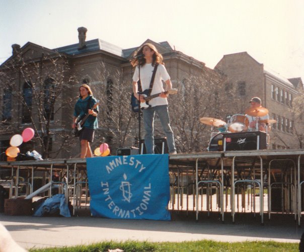 Some of our other mainstay cover songs (in addition to “Bittersweet,” which I already mentioned) included: “Black Boys on Mopeds” (Sinead O’Connor), “Mother” (Pink Floyd), “This One Goes Out to the One” (REM), “Walk on the Ocean” (Toad the Wet Sprocket – whom we hung out with after they did a show at ND’s SU, which was very cool ;-), and John Denver’s “Jet Plane.” We also threw in some traditionals from time to time, like “Red Is the Rose” (Irish traditional) and “Scarborough Fair.” So yeah: it pretty much ran the gamut; we were interested in all kinds of music. If there was a song that struck our fancy for one reason or another, we figured out how we could play it and make it our own. Good times, for sure.